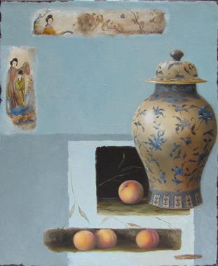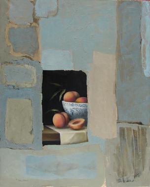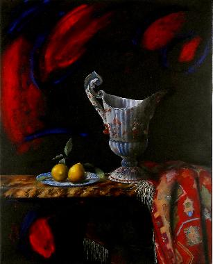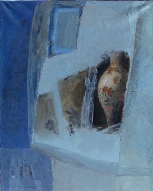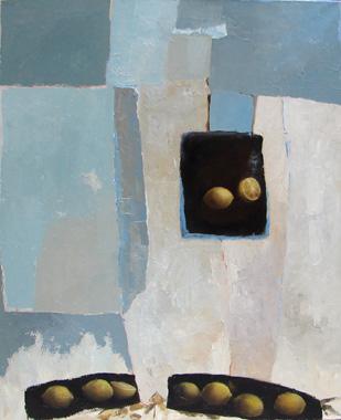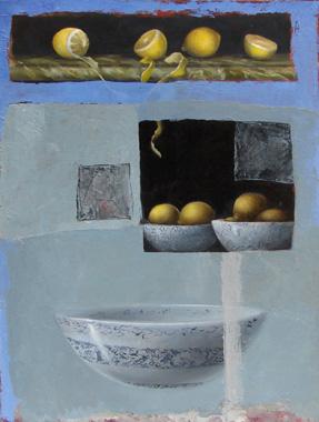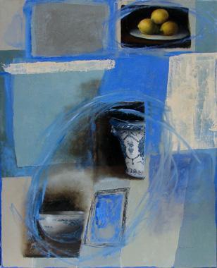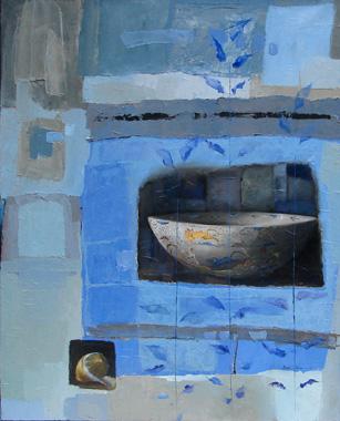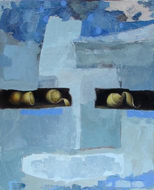 SON ?UVRE : Tr?s inspir?e par la peinture flamande, sa peinture refl?te de mani?re de plus en plus marqu?e un monde int?rieur o? l’on retrouve la trace des ma?tres anciens, avec une touche d’abstraction, et de po?sie. Dans cette s?rie des cama?eux de bleus et gris se m?lent en aplats abstraits. Ils se c?toient parfois avec douceur, parfois avec violence : un bleu de cobalt surgit brusquement de la compagnie douce de deux vert-de-gris qui cohabitent en silence et en toute subtilit? et finissent par trouver leur place pour finalement laisser la vedette ? un citron, une fa?ence qui semblent sortis tout droit d’une toile ancienne, comme pour nous rappeler que le pr?sent n’est rien sans le pass?.